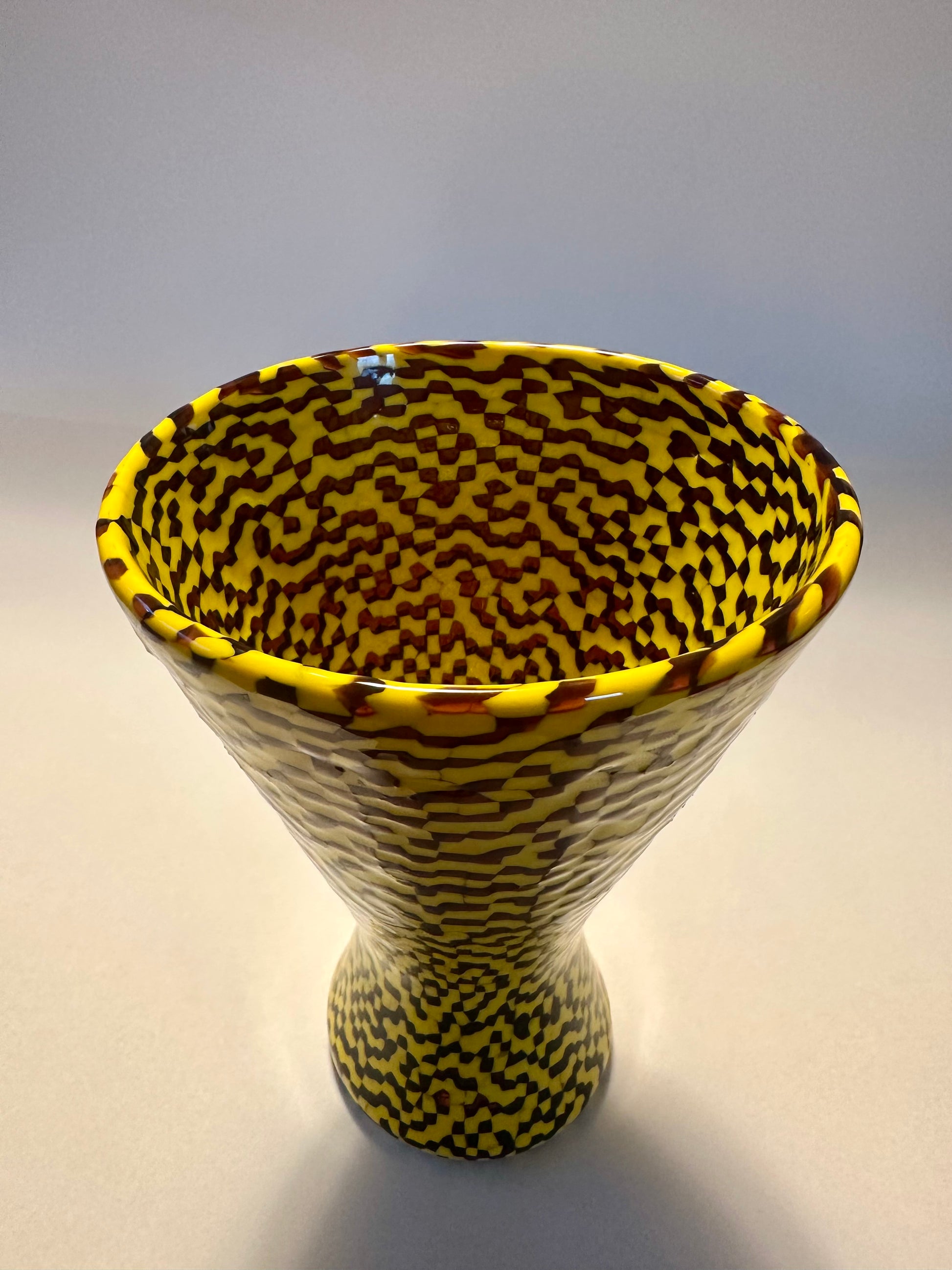 Vaso a murrine “Dama” disegnato da Paolo Venini, realizzato in raffinati toni tè e zolfo. La forma elegante e il delicato gioco cromatico valorizzano la maestria della lavorazione muranese. Un pezzo di grande pregio, ideale per collezionisti e amanti del design italiano.